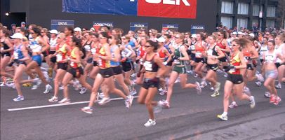 | Start of the women's olympic marathon trial, Sunday | Sarah checks out the finish line. |